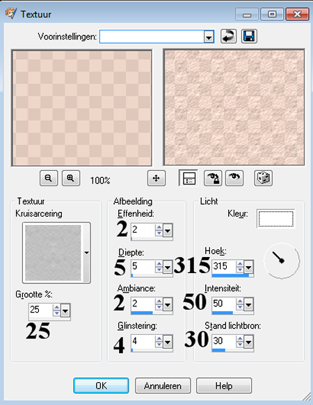 71-Effecten textuureffecten lamellen 2-30 licht van links/boven aangevinkt met zwart.